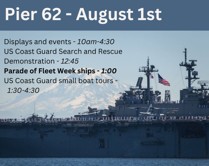 Fleet Week starts today with a lunchtime parade of ships. There are many viewing spots, but the main action will be on Pier 62. You are invited! More at https://waterfrontparkseattle.org/events?shwa